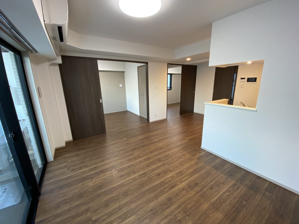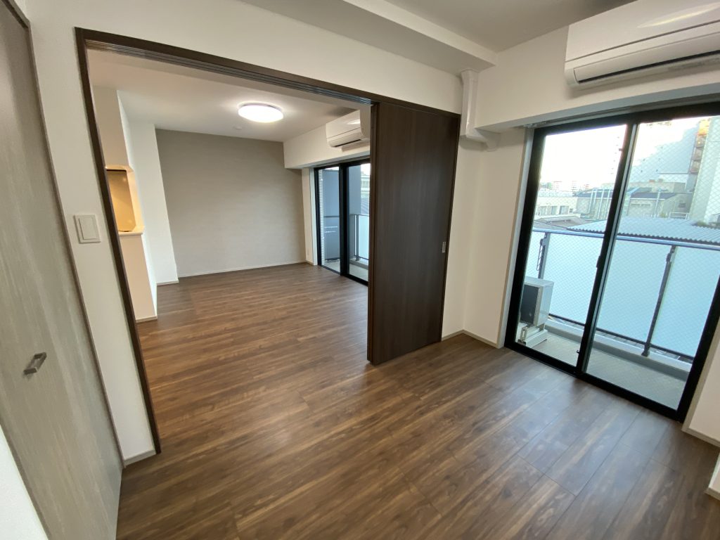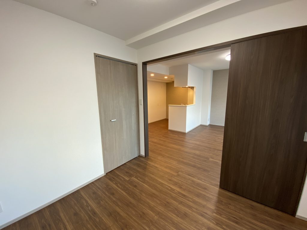 こちらのお部屋は、リビングと隣接している居室が引き戸で隔てられており、引き戸をフルオープンすることで、リビングと居室の空間を繋げることができます。