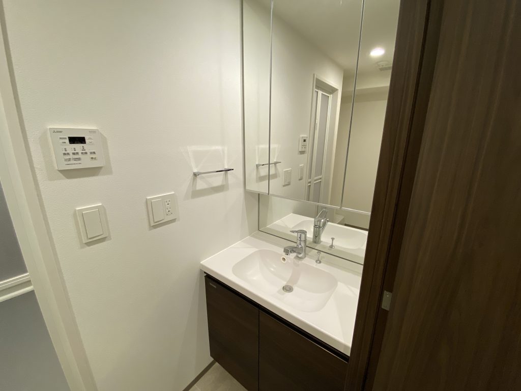 洗面台の鏡裏に収納スペースを備えており、歯ブラシや化粧品、スキンケア用品などをすっきりと整理可能。生活感が出やすいアイテムを目隠しでき、洗面空間を清潔感のある印象に保てます。